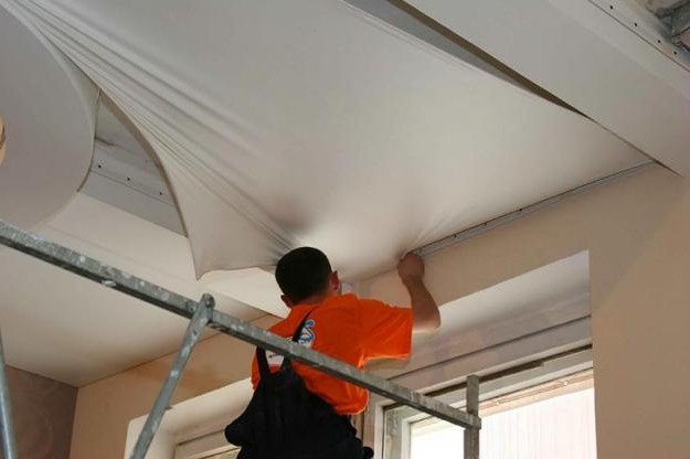 Для производства данного вида потолка используется поливинилхлоридная пленка. Материал отличается тем, что растягивается при нагревании, за счет чего и осуществляется его монтаж. Для этого требуется использовать специальную тепловую пушку. После нагрева полотно становится твердым и идеально ровным. Крепится материал специальным багетом. Стоит отметить, что «теряется» определенная высота потолка, порядка 25 – 30 см, что обуславливается особенностью монтажа. Однако, с другой стороны это и достоинство, так как под потолком можно разместить коммуникации или вспомогательный утеплитель.