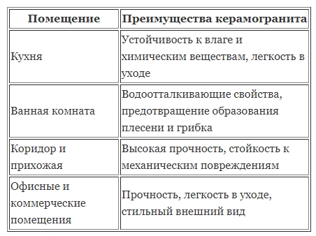 Для удобства представляем таблицу, где указаны основные преимущества керамогранита в различных помещениях: