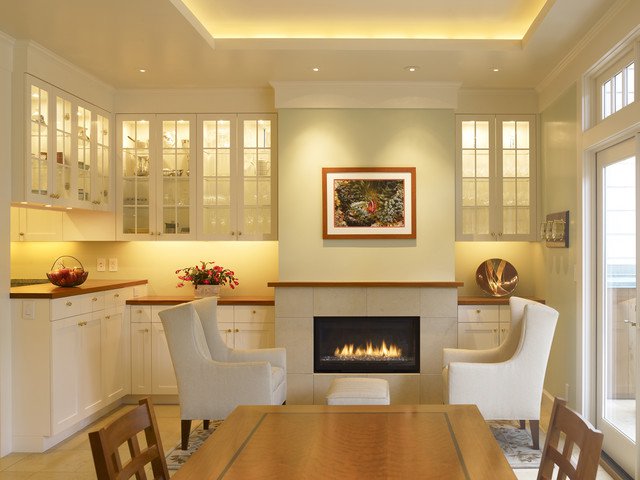 Столовую очень часто делаю совместную вместе с гостиной или же кухней. Главным считается правильное освещение обеденного стола. Освещение должно быть средним, не слишком ярким, но и нетусклым. Лучше всего подходит лампа, регулируемая по своей высоте, её обычно вешают над столом. Фоновым освещением можно осветить буфет или место, откуда выносятся и подаются все блюда. Подходят для этого потолочные светильники.