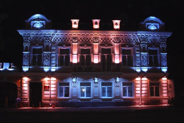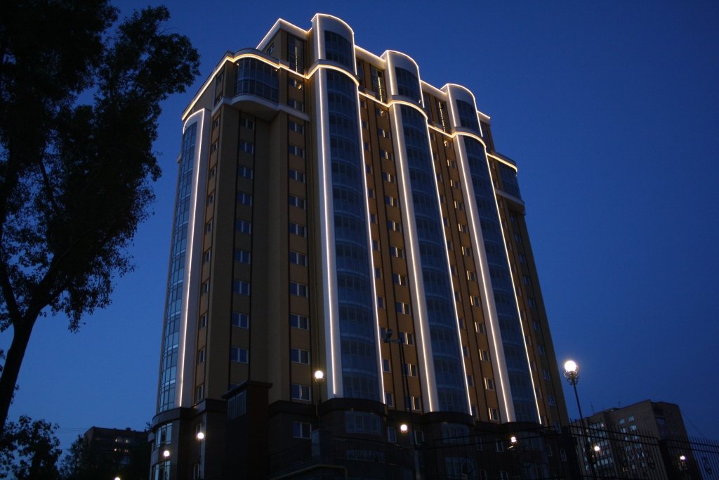Прдсветка зданий осуществляется в основном прожекторами и светодиодной лентой - дюралайтом. Подсветка прожекторами используется для подсветки самого фасада, а дюралайт для выделения элементов. Прожекторы позволяют создать направленный поток света, а использование разных цветов и их перемежение, особенно на зданиях, окрашенных в белый и светлые тона, позволяет создать совершенно новый по цветовой гамме экстерьер, в таком случае можно даже не узнать этот дом днем.