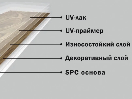 При изготовлении плит винилового ламината используется несколько разнородных материалов. Основной слой напольного покрытия составляет полиуретан - полимер, характеризующийся прочностью, упругостью и эластичностью. Для защиты от вредного воздействия светового и теплового излучения полиуретан обрабатывается специальным способом, включающим использование ультрафиолета. Для повышения прочности и стойкости к износу, трению, механическому повреждению, под полиуретаном находится слой поливинилхлорида.