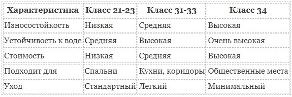 Для наглядности давайте сравним основные характеристики классов винилового ламината в таблице: