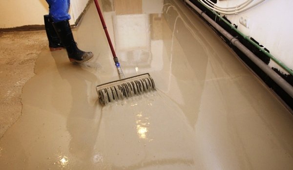 Всю площадь пола следует обработать за один раз, для этого необходимо, чтобы очередная порция раствора была готова точно к тому времени, как закончится предыдущая. Смесь необходимо тщательно перемешать, оптимально это делать дрелью с насадкой-миксером. Наливать пол следует начинать с дальнего от входа угла, постепенно приближаясь к выходу. Раствор следует сверху проходить игольчатым валиком, чтобы убрать пузырьки воздуха, образующиеся при заливке раствора.