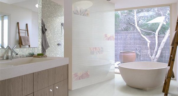 Отдельно можно выделить композиции из мозаики наборного вида, внешний вид которых позволяет сделать плавный переход от стен ванной комнаты к полу. Но, стоит отметить, что стоимость этого материала, как и работы по его укладке, значительно превышает аналог из керамогранита или классической плитки.