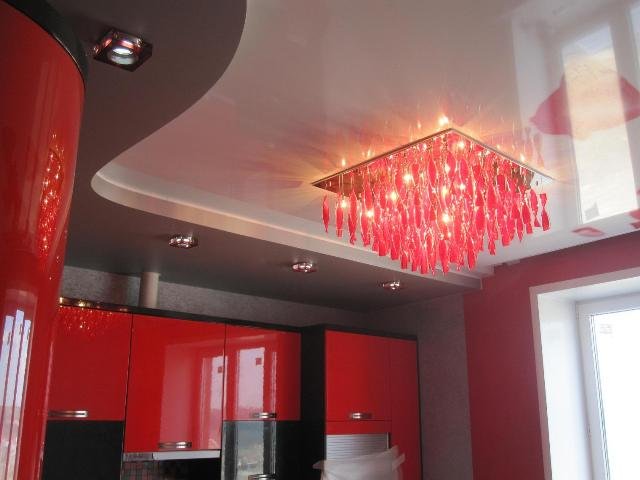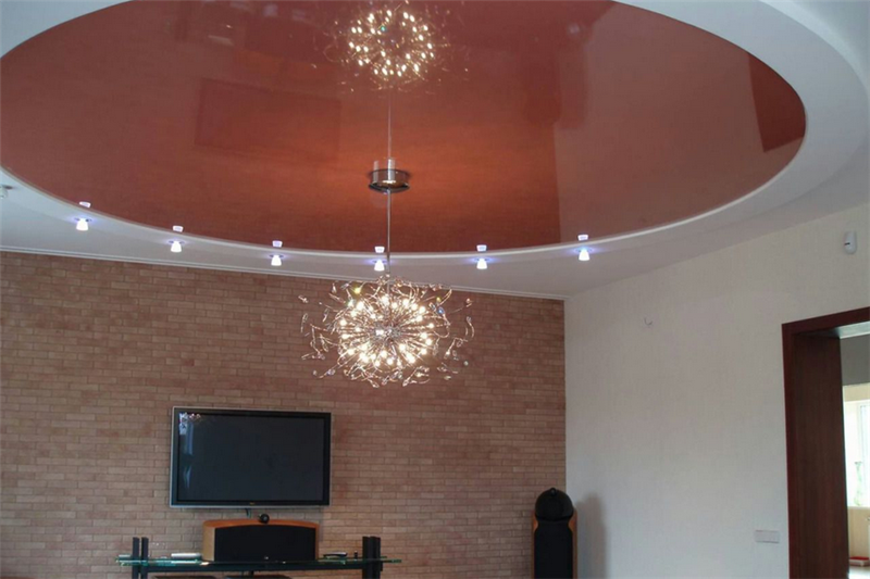 Как было сказано выше, подобные потолки современному потребителю доступны любой фактуры. К примеру, для небольших по площади помещений современные дизайнеры рекомендуют использовать натяжные потолки глянцевого вида, с помощью которых можно визуально увеличить пространство. Помимо этого, немалой популярностью пользуются двух- и многоуровневые конструкции, пленка которых может быть лаковой, матовой или любой другой. Благодаря подобному сочетанию цветов с фактурой, в помещении будет четко обозначаться граница, эффективно зонируя его. А добиться неповторимой атмосферы в комнате можно при помощи задействования различных осветительных приборов, встроенных точечных светильников, неоновых подсветок и прочих возможностей.