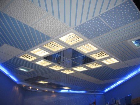 Полупрозрачные фактуры успешно могут комбинироваться с декоративным освещением, которое монтируют между несущим потолком и подвесной конструкцией. Объясняется это тем, что полупрозрачный материал способен эффективно пропускать через себя свет, и, включив светильники, устанавливаемые за потолком, светится начнет весь потолок, освещая тем самым все помещение. Внешне подобный эффект довольно интересен и необычен.