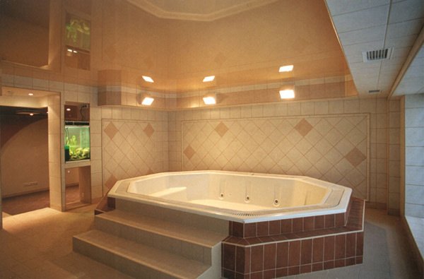 Керамическая плита – оптимальный вариант для отделки стен, вода сама будет отталкиваться от поверхности. Но вот для потолка плитка не подходит, тут рекомендуется выбирать другие материалы. Можно отделать потолок влагостойким гипсокартоном, покрасить его специальной краской, поклеить обои, которые предназначены для сырых помещений, а также применить пластиковую или деревянную вагонку, виниловый сайдинг.