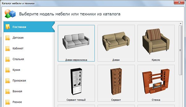 В вашем личном пользовании будет около 50 виртуальных моделей мебели и порядка 120 вариантов отделки помещений. А чтобы работа с проектированием стала максимально понятной, имеются внутренние категории, такие как «гостиная», «спальня», «прихожая» и так далее. Каждая категория уже имеет встроенные варианты различных деталей интерьера, этом может быть комод, холодильник, диван, рабочий стол и прочее.